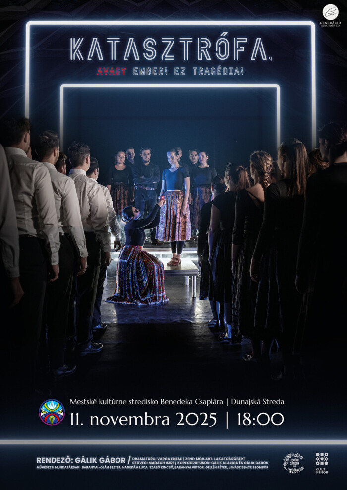 V najnovšom celovečernom predstavení sa súbor inšpiroval jedenástym obrazom Tragédie človeka od Imreho Madácha. Posúvaním hraníc tradícií Vás hra pozýva na cestu skúmania otázok ľudskej existencie. Nedávame odpovede, namiesto toho kladieme otázky, ktoré nútia divákov zamyslieť sa nad vlastným životom a svetom, v ktorom žijú. Adam, Eva a Lucifer – veční bojovníci ľudských zápasov, dilem a rozumu – nás vedú príbehom, ktorý odhaľuje nadčasové problémy súčasného kultúrneho života. Počnúc rozmermi lásky na pracovisku, cez spoločný vzťah medzi profesiou a prácou až po prelínanie profesionálnych snov a amatérskej skutočnosti – všetky vlákna sú spojené v tomto tajomnom, hlboko dojemnom predstavení. Hra, ktorá sa dotýka aj otázky moci a kontroly, nás povzbudzuje k prehodnoteniu nášho vlastného miesta vo svete. Predstavenie pozýva divákov na spoločné objavovanie, aby zistili, čo robí ľudský život tragédiou – alebo skôr naopak. Keďže je to KATASTROFA, alebo ČLOVEČE, TO JE TRAGÉDIA!